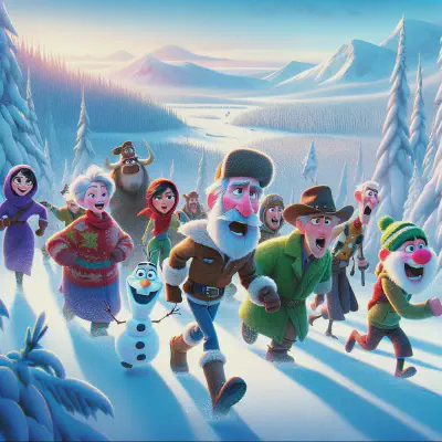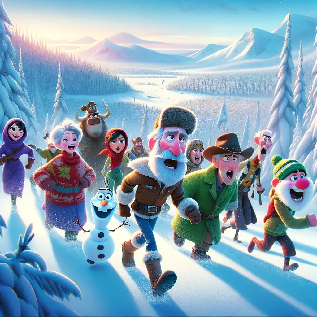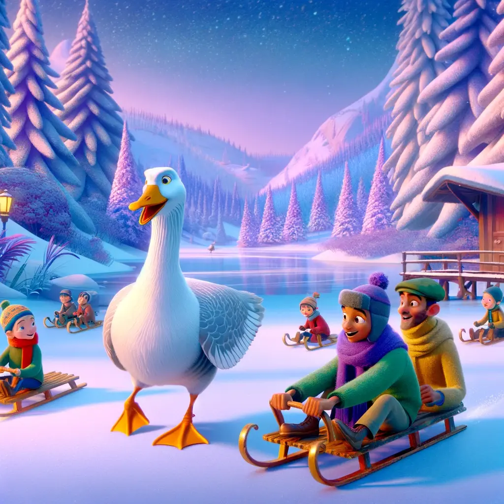 As they settled in, a group of children, laughing and sledding nearby, caught the Goose’s attention. Suddenly, in a surprising shift, the Goose’s demeanor changed. Its lights flickered angrily, and it let out a series of squawks, startling everyone. “Away with your noisy sleds, young rascals!” it squawked comically, flapping its wings as if chasing them away. The children, with shrieks of laughter and mock terror, scampered off, calling back apologies. The Goose, once satisfied, settled back into its storytelling pose, its lights twinkling merrily as if amused by its own antics.